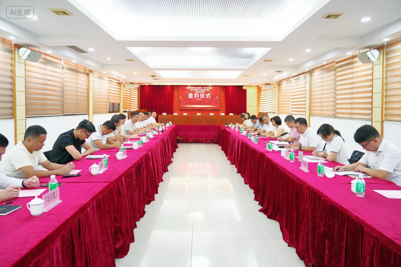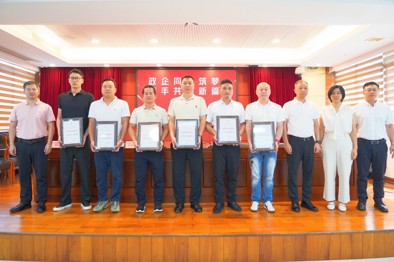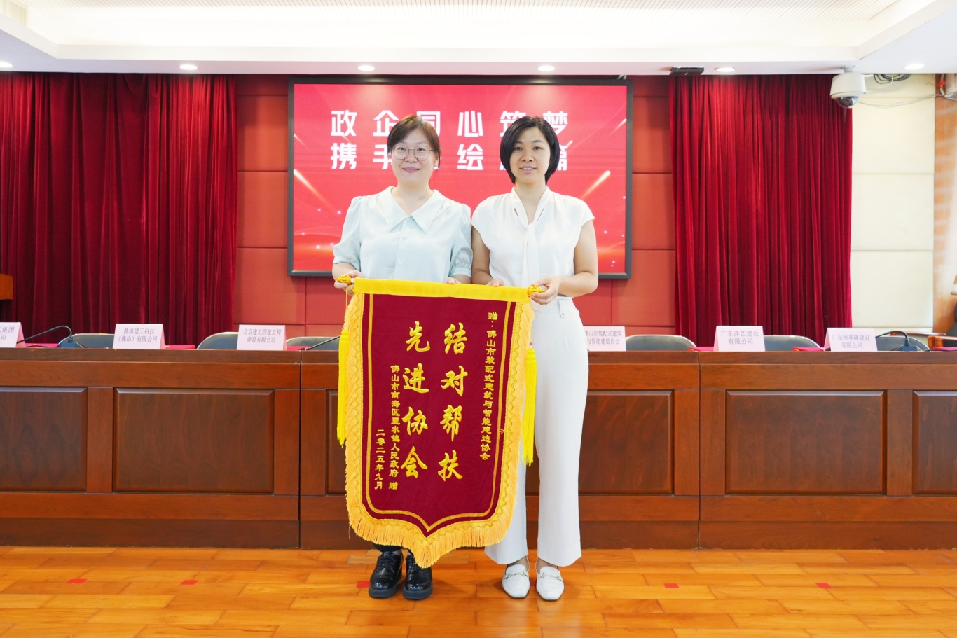 签订“百千万工程”项目帮扶协议书 会议现场,为弘扬企业家的奉献精神,佛山市住房和城乡建设局建筑市场监管科科长李玉媚向我会颁发了锦旗,南海区住房城乡建设和水务局副局长邓建波和里水镇党委副书记任雨为6家帮扶企业颁发了荣誉证书,感谢协会发挥行业枢纽作用,精准链接企业力量,为“百千万工程”注入专业动能。