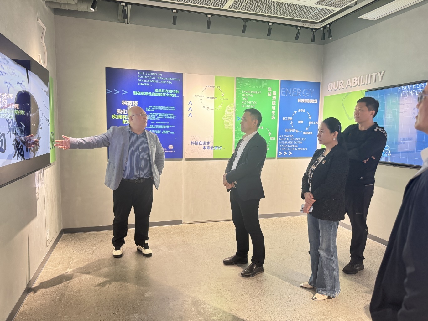 调研组首先参观了天汇建科的医疗展厅与睡眠体验馆,近距离了解公司在医疗健康空间设计与智慧化场景构建方面的实践成果。天汇建科展示了其在医疗空间装配化改造、病房模块化集成等方面的技术应用,并介绍了当前政策支持下相关项目落地情况。